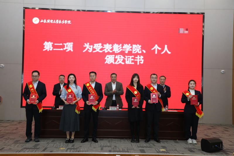 会上,于栋宣读了《关于表彰2025届毕业生就业工作先进集体和先进个人的决定》,学校领导为获奖集体和个人代表颁奖。就业工作先进单位代表国际商学院副院长吴国艳、财税金融学院副院长王小艺,就业工作先进个人代表国际商学院学工办主任连国伟、财税金融学院辅导员葛瑶先后作交流发言。