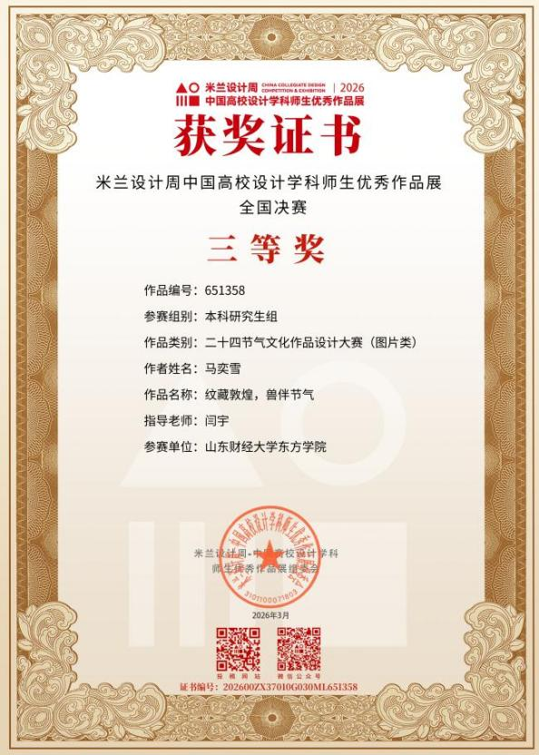 在米兰设计周中国高校设计学科师生优秀作品展二十四节气命题赛中,闫宇老师指导学生马奕雪创作的《纹藏敦煌,兽伴节气》斩获国家级三等奖。