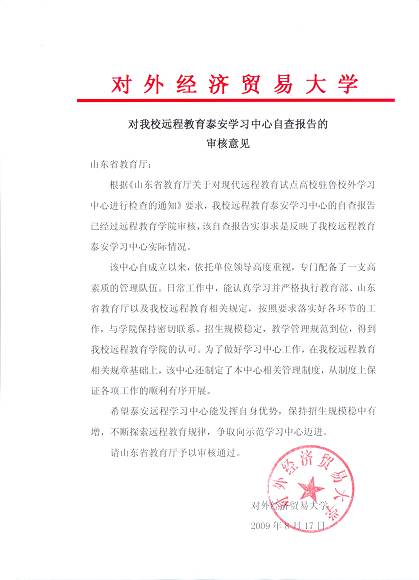 对外经济贸易大学对我中心自查报告给予充分肯定,结合期末考试时巡考老师对我中心工作实地检查结果做出的审核意见是:该中心自成立以来,依托单位领导高度重视,专门配备了一支高素质的管理队伍。日常工作中,能认真学习并严格执行教育部、山东省教育厅以及我校远程教育相关规定,按照要求落实好各环节的工作,与学院保持密切联系。招生规模稳定,教学管理规范到位,得到我校远程教育学院的认可。为了做好学习中心工作,在我校远程教育相关规章制度上,该中心还制定了本中心相关管理制度,从制度上保证各项工作的顺利有序开展。