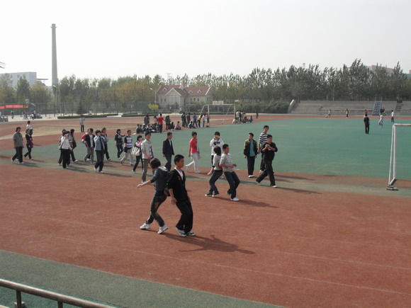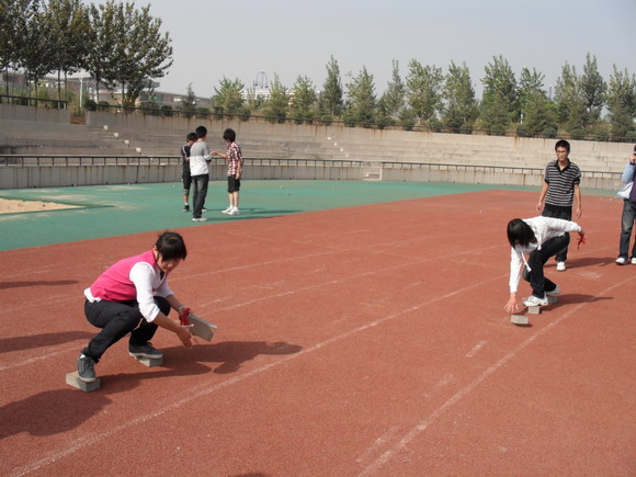 趣味运动会共分八项,分别是两人夹球跑,盲人穿衣,兔子跳,揣球跑,梅花桩,抡绳跳,搬书工以及跳绳跑。其中梅花桩是要求选手用三块板砖轮次前进,考验了选手的协调能力。背靠背,抡绳跳等是考验了选手的默契配合度,跳绳跑等则考验了选手的速度和灵活度。该项活动两班一组,以接力的形式按完成时间评比名次。