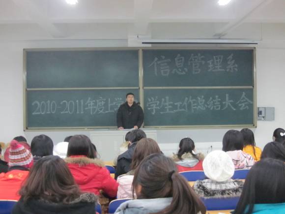 12月15日,信息管理系在唯美楼5104召开2010—2011学年上半年学生工作总结大会。信息管理系辅导员崔高老师、王群老师及学生会、学管会全体成员、班委参加此次会议。