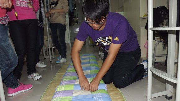 本次活动中大一新生都表现出较高积极性,活动还没有正式开始大一新生就在宿舍里把凉席、被子等都准备好,等待大二学长的教授。活动中,为了使大一新生能够透彻理解并快速学会,大二学生一边示范军被叠法一边做出详细的讲解并且传授一些叠军被的技巧。大一新生认真学习了叠军被的方法并且向大二学生提出了自己在叠军被时的问题,大二学生给出了正确的解决方法并做了示范。