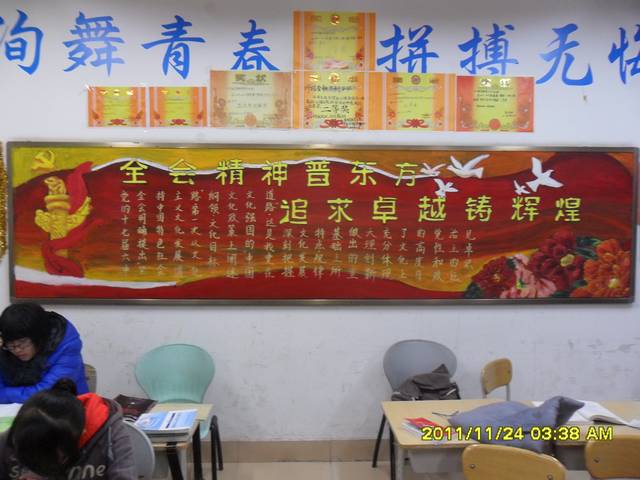 (通讯员 龚晶)为了丰富同学们的课余文化生活,庆祝十七届六中全会顺利召开,激发同学们的爱党热情,11月22日晚财政金融系进行了2011级黑板报评比活动。学管会、学生会负责同学参加了评比活动。