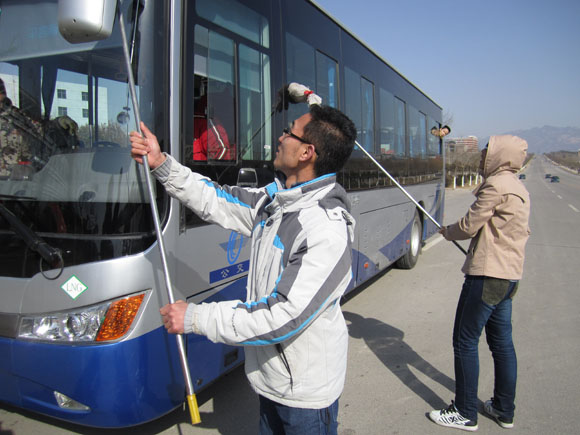 上午八点,人文艺术系学生在校门口的公交站牌下集合,经过简单的任务分配后,大家都精神抖擞的投入到了活动中。阳春三月依然寒风料峭,人文艺术系系旗随风飘扬。寒风中的同学们忙得不亦乐乎,有的同学为公交司机送上热水,有的帮助清洗公交车……有一位七十九岁热心的老爷爷与同学们谈论着雷锋的奉献精神,不计得失、助人为乐的精神,讲述了自己苦难的童年并教会我们忆苦思甜。虽然同学们的行动只是举手之劳,但是同学们依然体会着帮助别人所带来的发自内心的快乐,整个现场充斥着欢快的笑声。