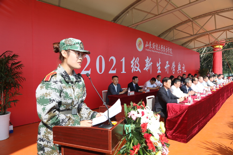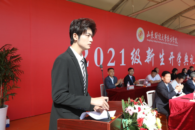 新生代表、人文艺术学院赵向东同学发言,她说,来到东方学院,感受到了家的温暖。一次刻骨铭心的军训,磨炼了自己的意志和信念,懂得了用心去感受磨练,才能在激烈的竞争中游刃有余。她表示要做一个心中有梦、眼里有光的“破壁少年”,在风华正茂的年纪书写青春的新篇章。
