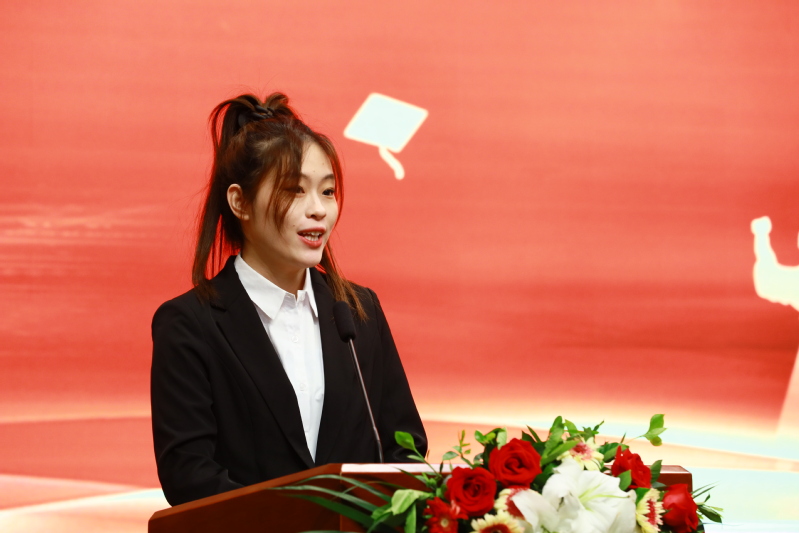 在校生代表、财税金融学院2019级税收学本科一班潘楠致辞,衷心祝愿各位学长学姐:跃入人海,各有风雨灿烂;跃入人海,做一朵奔涌的浪花:永远不要停止眼中的光芒,永远不要停下前进的脚步,祝前程似锦,万事胜意,未来可期,来日方长!