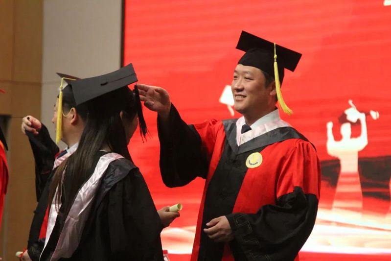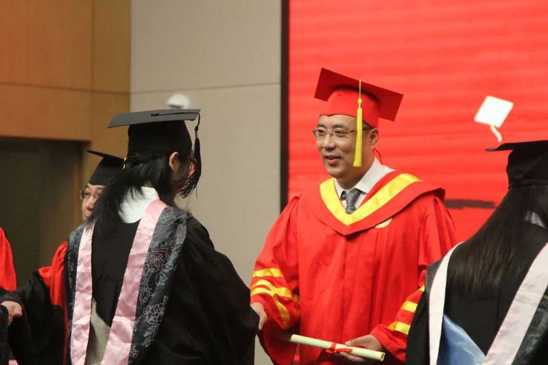 校领导为毕业生代表依次授予学位、拨穗并合影。