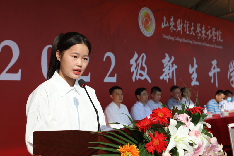 新生代表、数据科学学院吴柯谕同学发言,他说,来到东方学院,和蔼的老师、亲切热情的学长学姐都让他感受到了家的温暖。他表示要做一个心中有梦、眼里有光的“破壁少年”,以坚韧不拔的意志乘风破浪,以心系天下的情怀让青春远航。