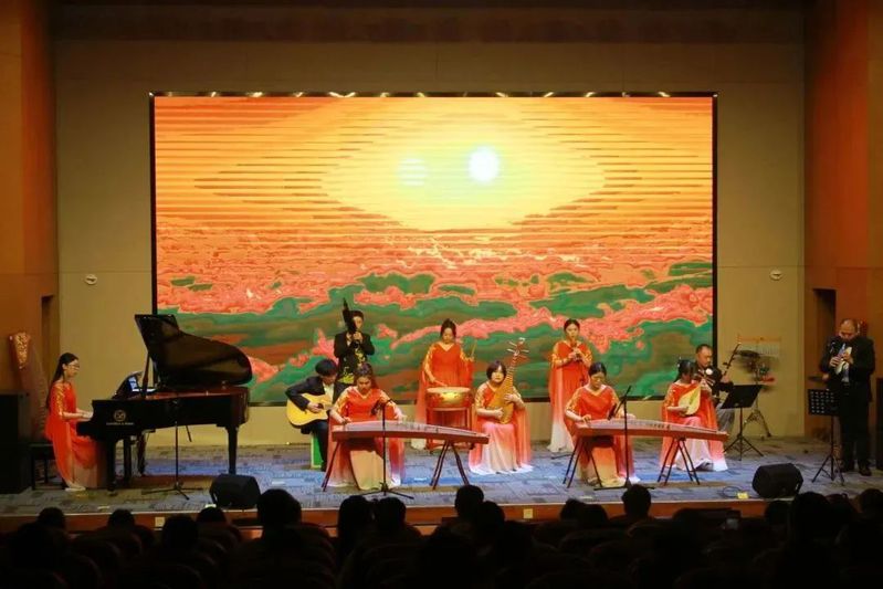 晚上19时,音乐会暨颁奖典礼正式开始。首先带来的是大合奏《盛世国乐》,传承中华文化,赞誉这盛世中华,为经典的民乐注入新时代的生机与活力,一曲乐章,道不尽中华民族文化的恒久魅力。