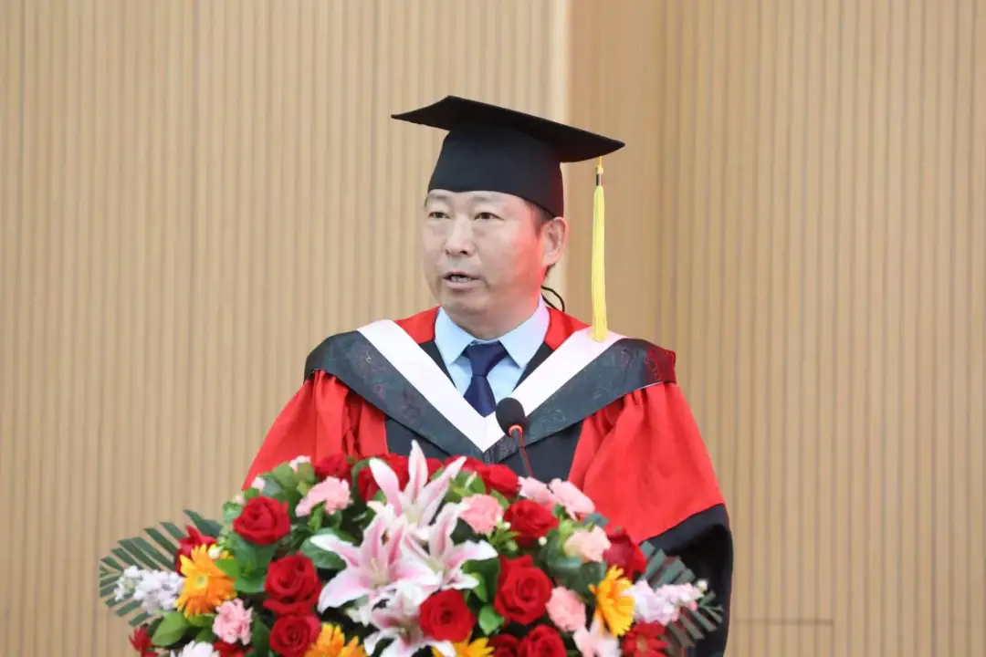 在热烈的掌声中,党委书记范玉宝致辞,代表学校向顺利完成学业的2024届毕业生表示热烈祝贺!他感谢同学们信赖东大、热爱东大,把诗意年华留在东大,把奔放青春绽放在东大,感谢同学们和老师们一起见证了学校的成长。