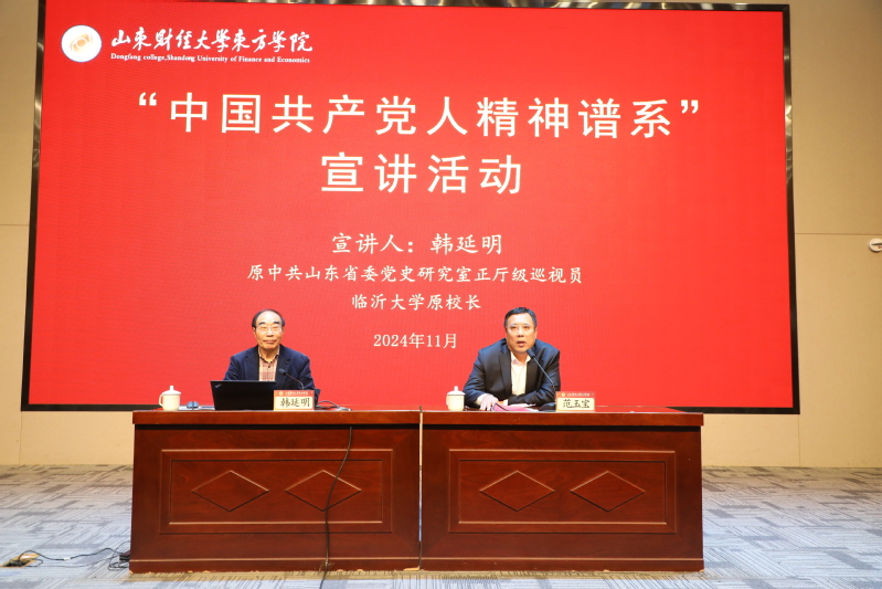 为深入学习宣传贯彻党的二十届三中全会精神和习近平总书记重要讲话精神,教育引导广大师生弘扬传承沂蒙精神、赓续红色血脉,11月20日上午,学校在图书馆学术报告厅举办“中国共产党人精神谱系”宣讲会。山东师范大学特聘教授、博士生导师,山东省革命老区建设促进会副会长韩延明以《沂蒙精神的精髓与弘扬》为题作主旨报告,党委书记范玉宝主持报告会并讲话。各部门、各单位负责人及师生代表300余人参加报告会。