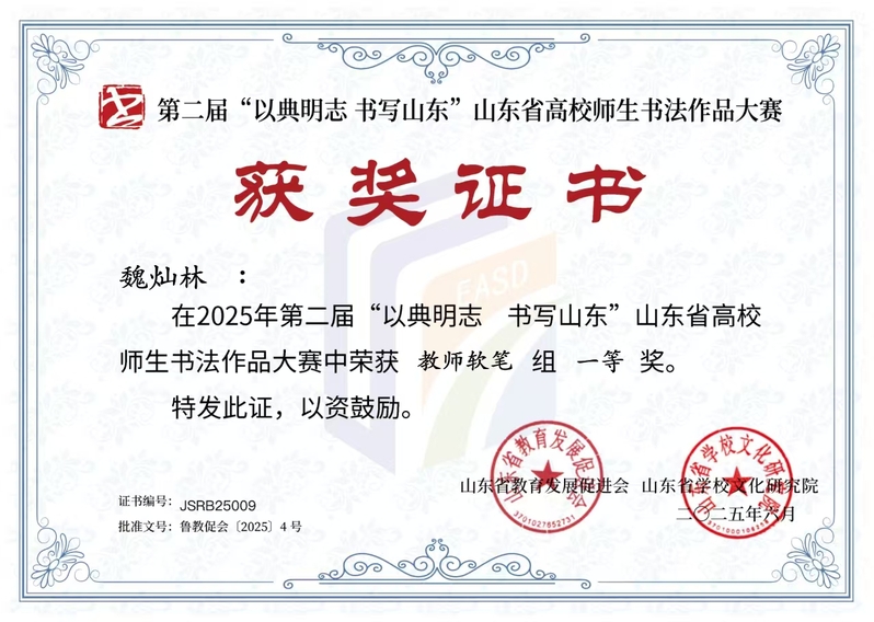 近日,由山东省教育发展促进会主办,山东省学校文化研究院、山东省教育发展促进会书法教育专业委员会承办的第二届“以典明志 书写山东”山东省高校师生书法作品大赛公布评选结果。我校人文艺术学院教师魏灿林的书法作品《到韶山诗联一则》荣获教师软笔组一等奖。