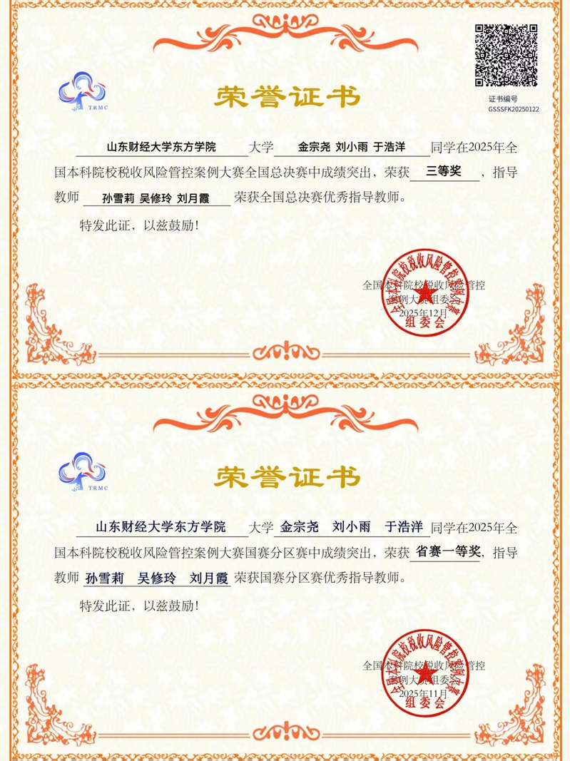 2025年12月6日,全国本科院校税收风险管控案例大赛总决赛在浙江财经大学顺利举办。我校财税金融学院学子金宗尧、刘小雨、于浩洋组成的“智税联盟”团队,在我校孙雪莉、吴修玲老师及校企合作单位刘月霞老师的指导下,撰写的“A管业股份有限公司纳税风险管控案例”最终斩获山东省一等奖、全国三等奖,以优异成绩彰显了我校财税专业人才培养的扎实成效。