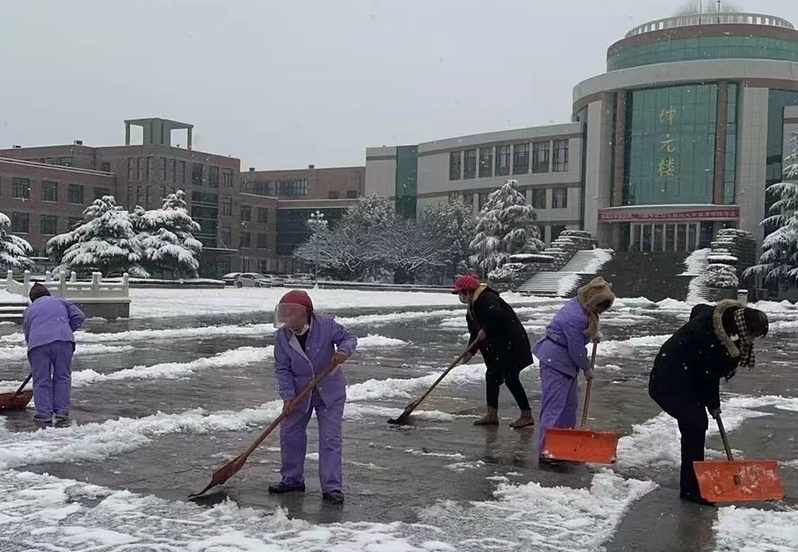 12月12日夜,暴雪突降,温度骤降,也给次日的全国大学英语四六级考试的顺利开考带来了挑战。为确保校园道路畅通,保障师生出行安全,学校提前部署,相关部门闻雪而动,迅速启动应急方案,切实保障了四六级考试的顺利进行。党政办公室及时调整班车时间,确保监考人员安全准时到校;后勤管理处根据天气预报得知考试前一日有降雪,提前召开应急会议,制定专项除雪预案。13日清晨 6 时 20 分,物业工作人员全员到岗,分组作业,冒着严寒对公寓区、教学楼、考场周边及主干道开展清扫,同步进行除雪工作。在开考前一小时,主要道路和考场入口地面已经全面清扫完毕,最大程度降低了冰雪天气对师生出行的影响,为考试创造了良好的外部环境。