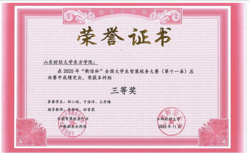 2025年“衡信杯”大学生智慧税务大赛设置校内赛、省赛、总决赛三个阶段赛。9月28日,财税金融学院组织开展校内赛,选拔出3支代表队参加省赛。11月4日,省赛如期举行,经过激烈角逐,由刘小雨、于浩洋、王丹梅组成的代表队以山东省省赛第一的成绩斩获省赛一等奖;由刘昊月、陈双凤、孙吉萱组成的代表队与赵世潇、陈文慧、楚君彤组成的代表队均获得省赛二等奖。11月29日,总决赛在江西财经大学拉开帷幕,共有来自西南财经大学、江西财经大学、海南大学、山西财经大学等知名院校在内的98支队伍入围决赛。我校代表队在高手云集的比赛中披荆斩棘,最终荣获全国三等奖。