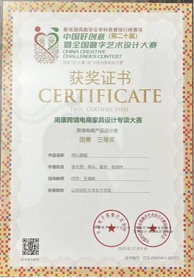 近日,第20届中国好创意大赛南康跨境电商家具设计专项赛圆满落幕。我校人文艺术学院2022级环境设计专业学子张增祚(指导教师:闫宇、王倩颖)斩获国赛三等奖,李嘉睿(指导教师:闫宇)荣获优秀奖和入围奖,王昕莹荣获入围奖(指导教师:闫宇、王倩颖)