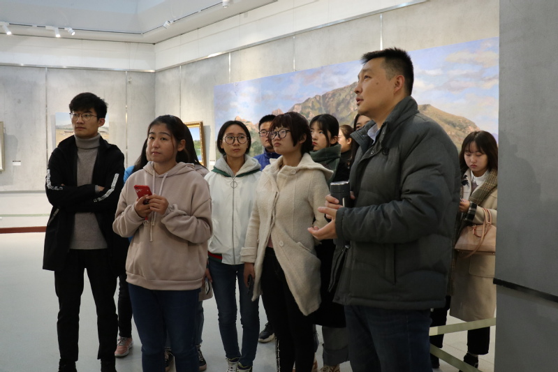 在美术馆三楼展厅,杨晋东老师带领同学们观赏与分析画作,悉心教导,传授经验,并在讲解过程中与创作者交流,使同学们能加深印象并从中学习。杨晋东老师的两幅作品(《石板岩》、《太行大峡谷》)入选,他讲到,创作就是要把自己心中最真实的想法展现在画笔下,这样才是最舒服的状态,才是真情实感的流露。