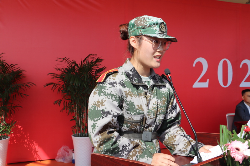 我院21级新生赵向东作为新生代表上台发言,她表示军训只是大学第一课,在以后的大学生活中,不仅要学知识长本领,更要努力成长为爱国奉献、追求卓越的新时代青年。要做一个心中有梦,眼里有光的“破壁少年”,在风华正茂的年纪书写青春的新篇章。