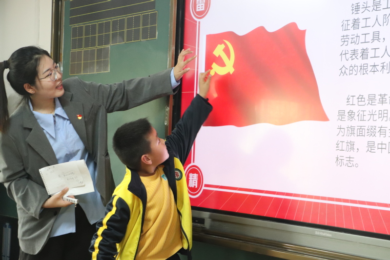 随着中国少年先锋队队歌的响起,一张张小脸难掩心中的激动与兴奋,满怀激情地高唱队歌,用激昂嘹亮的歌声表达内心的兴奋与激动,以及想要早日成为少先队员的殷切期望。生动的讲解和图文并茂的课件,将同学们的注意拉向雷锋同志的故事。孩子们聚精会神的听着讲解,观看视频,积极回答,认真思考着视频里雷锋做了哪些好事,记住了“雷锋出差一千里,好事做了一火车”,对雷锋同志的敬佩油然而生。讲述过程中宣讲员也与小朋友们积极互动,提问哪些是生活中的雷锋精神,并通过“击鼓传花”小游戏,鼓励小朋友们大胆发言,讲述身边的雷锋故事。“雷锋”就在我们的身边,要学习雷锋的奉献精神和“钉钉子精神”,从小学雷锋,永远跟党走,把红色资源转化为教育资源,用红色文化引领一年级同学们健康成长,扣好人生第一粒扣子。