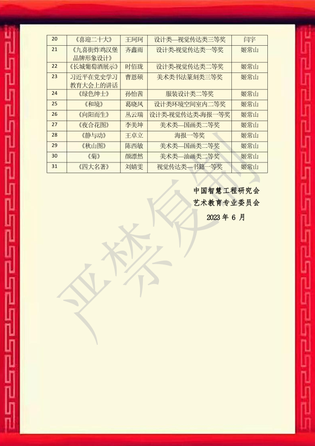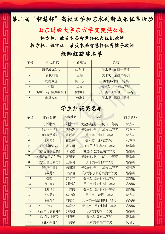为提高学生的审美和人文素养,促进学术团体的交流与合作,中国智慧工程研究会艺术教育专业委员会举办第二届“智慧杯”高校文学和艺术作品创新成果征集活动,该活动自三月份启动以来,受到师生广泛的关注。人文艺术学院认真组织,师生通过原创,激发个性化,发挥创新性思维,创作出高质量的艺术作品。我院教师组3人荣获一等奖;3人荣获二等奖。学生组7人荣获一等奖;16人荣获二等奖;8人荣获三等奖。韩方林荣获优秀组织教师;韩方林、姬常山荣获优秀辅导教师。