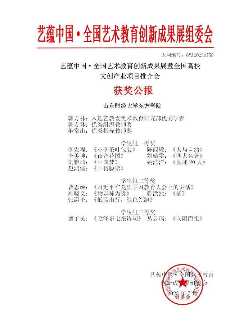 近日,中国文化信息协会艺术与设计教育专业委员会举办的首届“艺蕴中国·全国艺术教育创新成果展暨全国高校文创产业项目推介会”传来捷报,人文艺术学院师生取得优异成绩。学生组7人获得一等奖,4人获得二等奖,2人获得三等奖。韩方林入选艺教委美术教育研究部优秀学者并获得优秀组织教师奖;姬常山获得优秀指导教师奖。