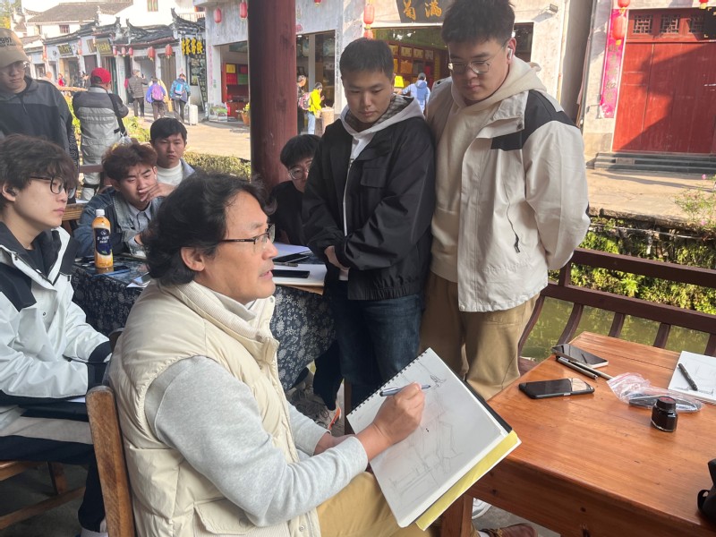 抵达江西的同学们分别前往李坑景区、江岭、彩虹桥、景德镇的陶瓷厂、陶溪川,在青瓦白墙与瓷都风采中汲取灵感;抵达安徽的同学们则前往宏村、屏山村、西递村,在古村中感受悠久的人文风采。写生期间,同学们热情高涨,白天外出作画,晚上师生共同进行总结和点评,时间安排紧凑,学习氛围浓厚。