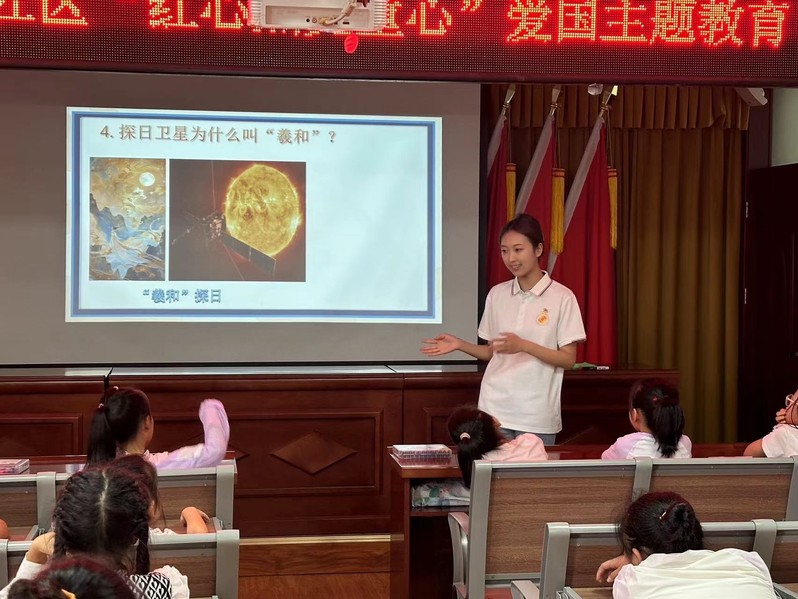 下午两点半,人文艺术学院志愿者们也开展了本次社会实践活动的第一次活动“红心照亮童心”爱国主义教育活动。同学们通过细心的讲解,将老一辈航天人”特别能吃苦、特别能战斗、特别能攻关、特别能奉献”的精神做了赓续传承。