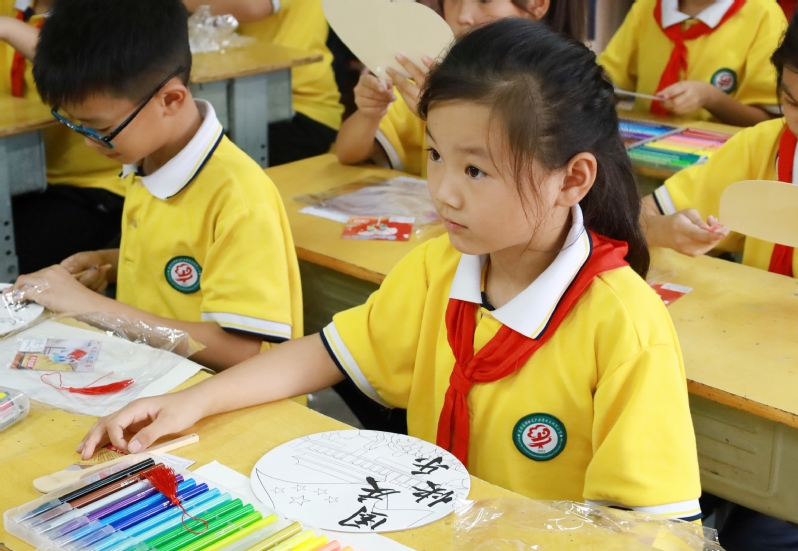 感人的故事宣讲和爱国知识竞答之后,宣讲团成员与小朋友们一同制作国庆主题团扇和创意立体贴画。
