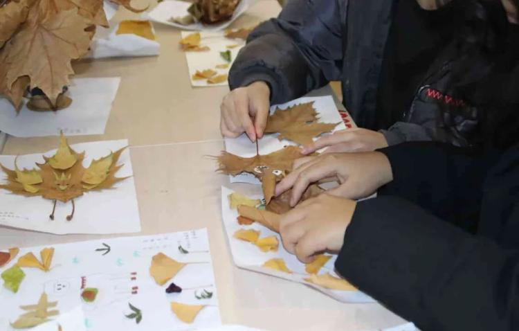 “八月蝴蝶来,双飞西园草”描绘了八月蝴蝶在西园草丛双飞的生动场景,虽然已入初冬,但蝴蝶枝头嬉戏的场景却被保留了下来,同学们采集落叶,收集秋日的馈赠,通过拼剪凑的手法,将艺术融入其中,将生命融入其中,终成就一幅秋日蝴蝶。