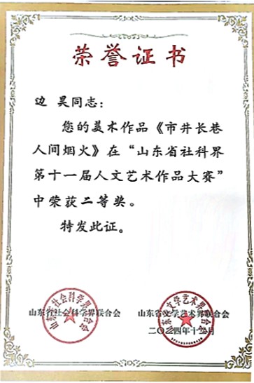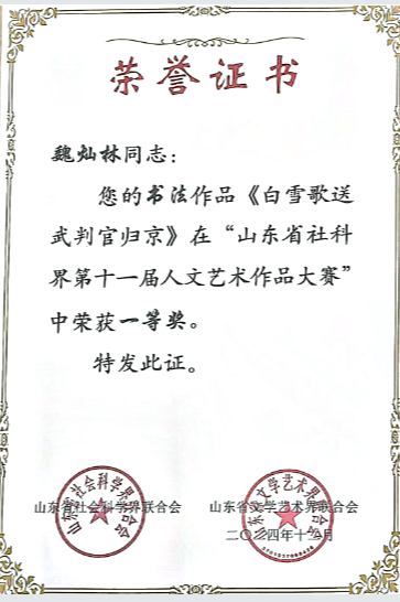 近日,由山东省社会科学界联合会、山东省文学艺术界联合会主办,省社会科学发展交流中心、山东省美术家协会、山东省书法家协会、山东省摄影家协会承办的山东省社科界第十一届人文艺术作品大赛公布评选结果。我校人文艺术学院教师魏灿林的书法作品《白雪歌送武判官归京》荣获一等奖,边昊的美术作品《市井长巷 人间烟火》荣获二等奖。