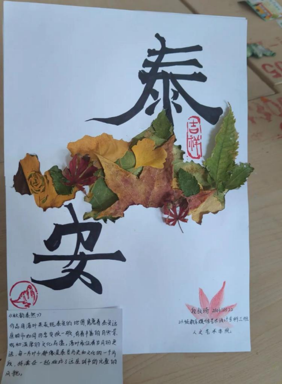 金秋时分,落叶正当时,无数落叶轻轻飘落,秋意晕染东大校园徘徊在泰山脚下,一幅象征着岁月更替的《秋韵泰然》便由落叶织就,落叶拼接而成的泰安地图带着岁月的痕迹,上面每一片叶子都代表着泰安的历史与文化,它们是泰安的象征。