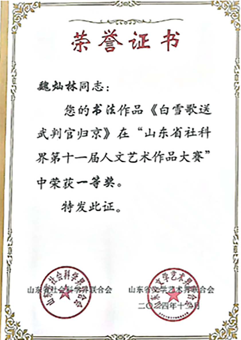 山东社科界人文艺术作品大赛获奖证书