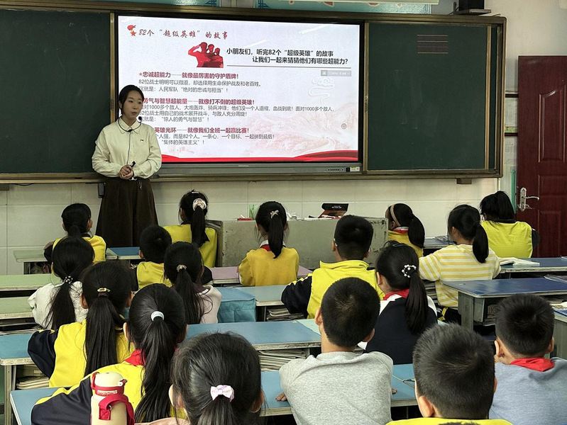 随后,学生党员以“82位‘超级英雄’”的生动比喻,引入了“刘老庄连”82位勇士为掩护群众转移,与数十倍之敌血战到底、全部壮烈牺牲的英雄故事。“小朋友们,大家猜猜这些‘超级英雄’拥有怎样的‘超能力’呢?”互动提问瞬间点燃了课堂气氛。“我知道!他们团结一心,共同对抗敌人!”“他们勇敢无畏,而且非常聪明!”孩子们争先恐后地举手回答,清脆的声音此起彼伏。通过观看纪念中国人民抗日战争暨世界反法西斯战争胜利80周年大会上,“刘老庄连”战旗通过天安门广场的珍贵影像,英雄集体的形象在孩子们心中愈发高大、清晰,他们对“军民团结、鱼水情深”的内涵也有了更为真切的体会。