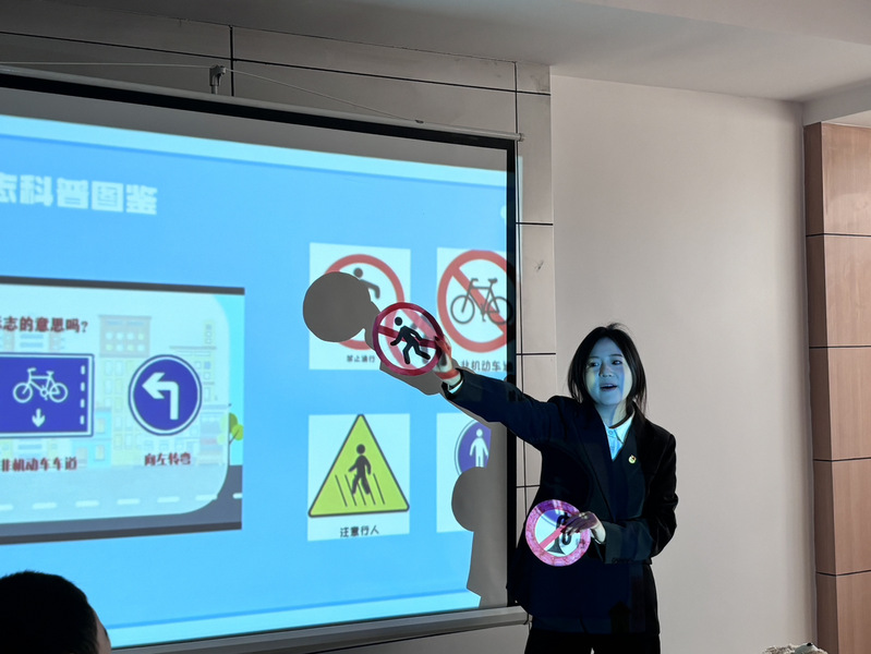 活动现场,志愿者们结合孩子们的认知特点,通过展示色彩鲜艳的交通安全标识卡片,依次讲解了红绿灯、斑马线、禁止通行等常见标识的含义。“红灯停、绿灯行、黄灯亮了等一等。”小朋友们齐读交通规则。学生志愿者们借助生动的动画短片,直观呈现了横穿马路、在马路上追逐打闹等危险行为的后果,让小朋友们在沉浸式观看中感知安全出行的重要性。