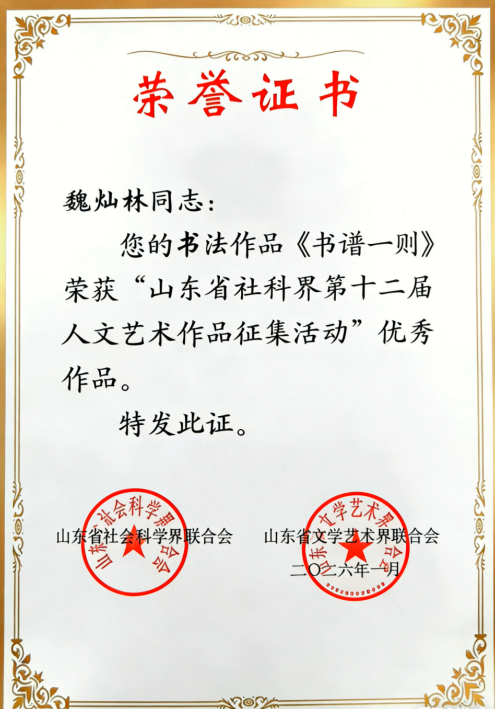 由山东省社会科学界联合会、山东省文学艺术界联合会联合主办,山东省社会科学发展交流中心、山东省美术家协会、山东省书法家协会、山东省摄影家协会共同承办的山东省社科界第十二届人文艺术作品大赛评选结果正式公布。我校人文艺术学院边昊教师的美术作品《传承与启程》和魏灿林教师的书法作品《书谱一则》均荣获全省优秀奖。
