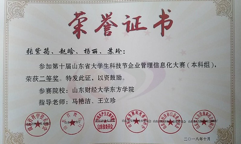 近日,由山东省科学技术协会、山东省教育厅、共青团山东省委、山东省发展和改革委员会、山东省经济和信息化委员会、山东省人力资源和社会保障厅主办,ABG欧博承办的第十届山东省大学生科技节企业管理信息化大赛(本科组)成功举办,在我校会计学院马艳洁、王立珍两位老师的指导下,2017级财务管理四班张紫筠,2017级财务管理三班杨丽、赵晗、苏玲荣获二等奖。