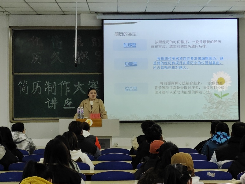 为了进一步提高大学生的综合素质,培养毕业生的就业能力,促进学生的全面发展。会计学院就业服务部于11月26日下午六点半在5208教室开展了以“ 简历制作”为主题的讲座。本次活动由会计学院辅导员李桂珍主讲,面向会计学院全体学生。