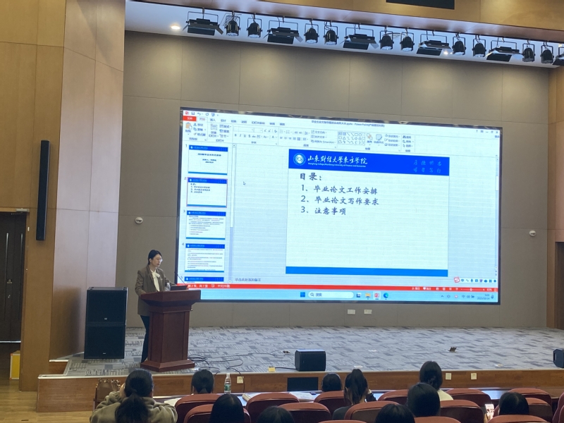 为稳步推进会计学院毕业论文工作,提高学生毕业论文质量,会计学院副院长巩潇娴结合自身教学和科研工作经验,就毕业论文的目的意义、撰写要求、时间安排等方面进行详细讲解,重点围绕如何开展毕业论文选题进行指导,强调学术规范、本科论文质量与科学实验的重要性,鼓励同学们积极与指导教师沟通交流,做好论文的数据支撑,完善毕业论文的撰写工作。接着,会计学院财务管理专业老师邹少冰围绕如何选题、如何分析、如何梳理文献、如何分析现状与发现问题等,从不同角度、不同方面深入浅出地为同学们讲解了毕业论文的写作方法,并对毕业论文撰写的学术性、创新性、科学性和规范性等提出要求,并针对论文格式、字体和排版中常见的错误进行了重点提醒。之后, 大数据与会计教研室主任张广源从毕业实习的重要性、毕业实习指导和说明、实践报告指导与说明三个方面为大家进行了详细的讲解。