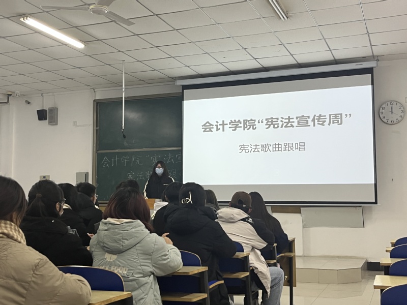 12月4日至7日,会计学院组织学生在多媒体教室进行宪法歌曲《宪法伴我成长》的学习跟唱活动,台上领唱同学声音洪亮、感情饱满,台下同学也都保持着积极的学习态度,现场氛围活跃,活动顺利推进完成。