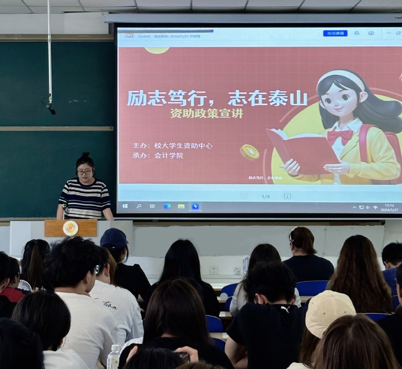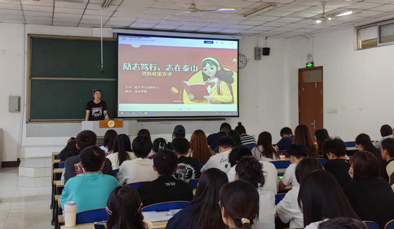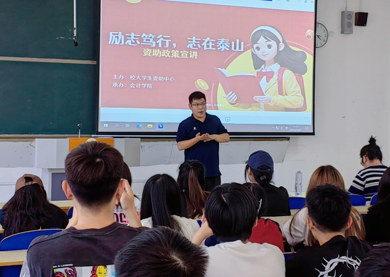 为使同学们更好地了解国家资助政策,减少因经济原因失学的学生数量,深入贯彻国家和地方有关学生资助政策,让学生体会到党和国家的深切关怀,鼓励广大学生刻苦学习,励志成才,报效祖国,5月27日下午,学校资助管理中心主办,会计学院承办的“励志笃行,志在泰山”资助政策宣讲活动在唯美楼308举行。