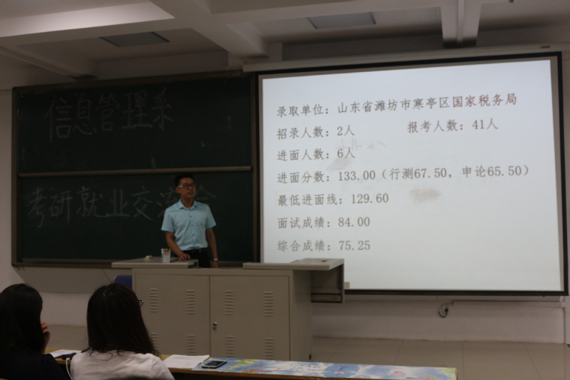 5月30日下午,信息管理系考研就业经验交流会在唯美楼206教室举行。会上,该系2014级电子商务本科一班栾庆玲和张纳川同学分别就考研和公务员考试分享了自己的成功经验。信息管理系2015级、2016级和2017级全体同学参加了此次交流会。