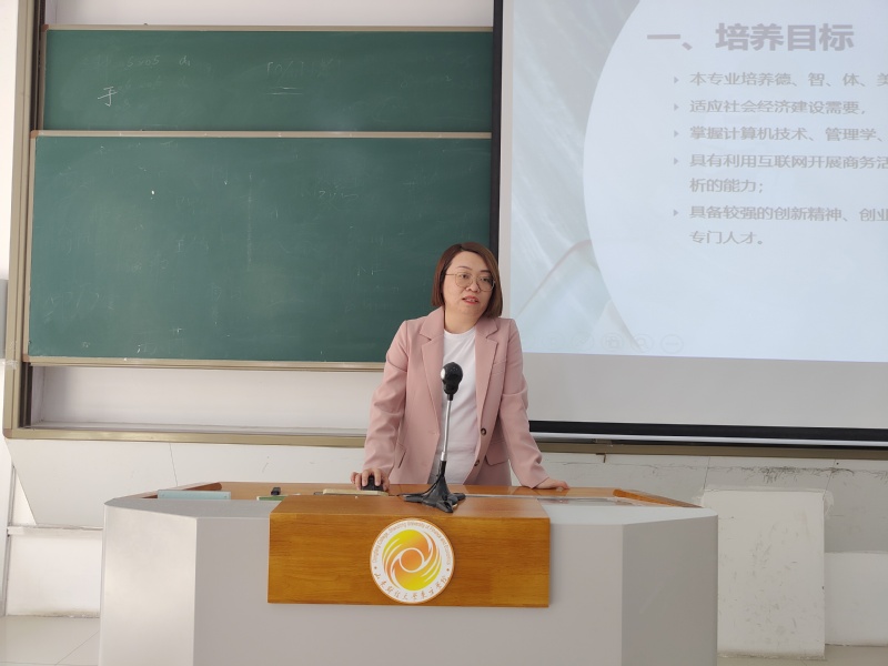 电子商务教研室主任谭峤副教授结合电子商务专业的特色,对该专业人才培养方案进行了详细解读,介绍了该专业的课程体系、培养目标以及毕业要求,并以习主席的“电商,大有可为”引出电商行业近几年的发展态势。她建议同学们积极参加电子商务竞赛,以赛促学,提升自身能力。最后她通过分享优秀毕业生的发展现状,鼓励同学们勇于探索、努力尝试,为自己的未来努力拼搏。