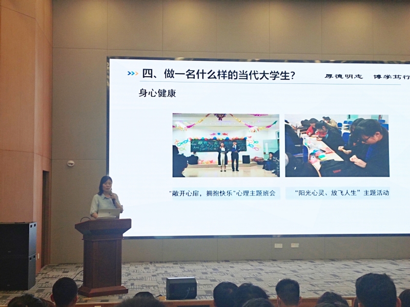 首先,谢蕙从学院的组织架构、人才培养模式、学院特色文化活动等方面深入介绍了学院基本情况,同时引出做一名什么样的大学生这一值得深思的问题,教育大家要做一名热爱祖国、热爱学校、遵守规则、诚实守信的当代大学生。她要求大家要遵守防疫制度、确保自身安全、多参加学院组织的学科竞赛和各项活动,促进自身全面发展。