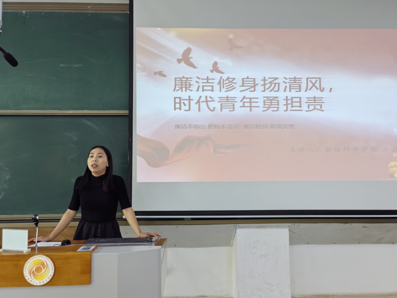 为深入贯彻廉洁教育理念,引导青年学生树立正确的价值观和道德观,筑牢廉洁自律的思想防线。5月中旬,数据科学学院陆续开展了以“厚植廉洁文化,涵养清风正气”为主题的大学生青廉课堂讲课活动。本次活动由辅导员亓晶、黄珍担任主讲人,数据科学学院全体党员、积极分子及学生干部参加。