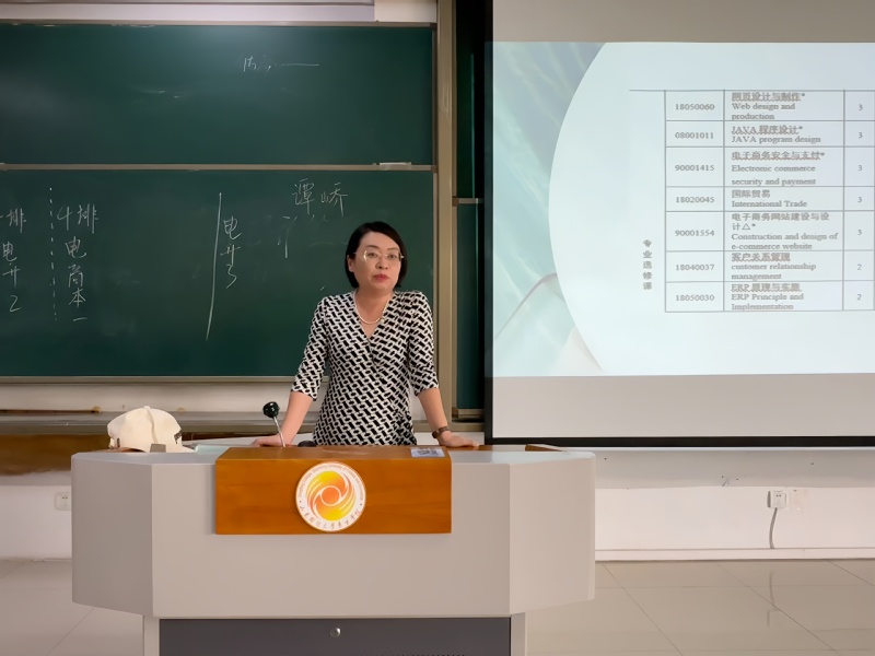 电子商务教研室主任谭峤结合电子商务专业的特色,对该专业人才培养方案进行了详细解读,介绍了该专业的课程体系、培养目标以及毕业要求。她建议同学们积极参加各类学科竞赛,以赛促学,提升自身能力。最后她通过分享优秀毕业生的发展现状,鼓励同学们勇于探索、努力尝试,为自己的未来努力拼搏。