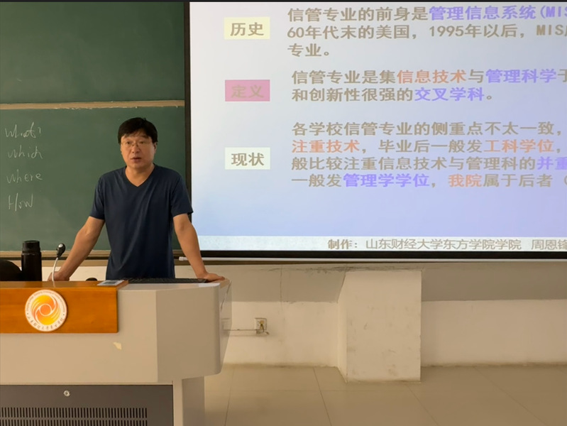 信息管理与信息系统教研室主任周恩锋介绍了该专业的知识、能力和素质结构,他结合从业前景,向同学们解读专业人才培养方案,明确专业学习方向和意义,并结合人才需求剖析了就业前景,建议同学们保持积极的心态、学好专业知识、掌握专业技能鼓励大家尽快调整学习态度、转变学习方法,适应大学新阶段的学习。