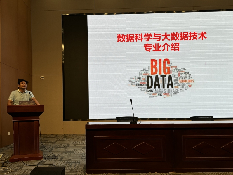 数据科学与大数据技术教研室主任孙青介绍了该专业的培养目标,向同学们展示了基础课程、专业课程和特色课程相结合“三位一体”的课程体系,并从大数据专业的来源、用途以及未来的发展前景等方面入手,介绍了本专业的人才需求和就业定位。