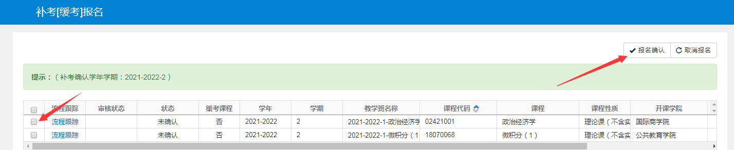 报名流程:教务系统首页“报名申请”—“补考(缓考)报名”—选中报名课程—点击右上角“报名确认”按钮—报名成功(见下图)。