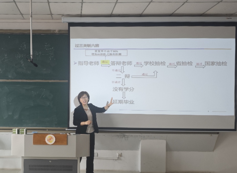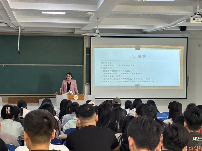 电子商务教研室主任谭峤为电子商务专业的学生们以论文要求、流程、选题材料示例、格式的顺序进行解读,要求学生重视毕业论文工作,调整心态,打消顾虑,明确认识到导师的作用,消除对导师的畏惧心理,把注意力放到如何写好论文上,遇到困难积极主动和导师沟通修改论文,不玻璃心、不内耗。强调学生在进行选题时要有独特性、新颖性、创新性,要在广泛阅读资料的基础上,慎重选择。