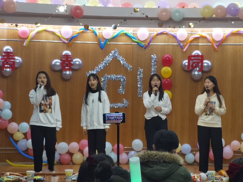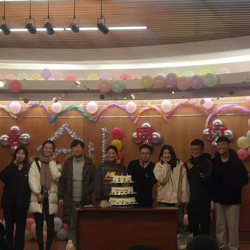 祝福视频播放完毕后,灯光骤暗,在缓缓响起的生日祝福歌中,写有第六届创新创业协会,青春有你,一起努力的三层特制蛋糕被推上舞台,大家迎来了分享蛋糕的快乐时光,相机里捕捉了一张张洋溢着笑容的脸庞。